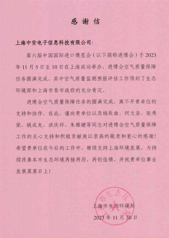 上海環(huán)監(jiān)中心就中安科技在21年國際進博會空氣質(zhì)量監(jiān)測預報工作中杰出貢獻送來感謝信!(2021/12/31)